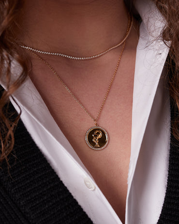 A little bit of layering goes a long way. Start with a choker length necklace, then add a charm stack on a longer basic chain. Increasing the length of the lower chain draws the eye downward and gives the illusion of a longer neckline.