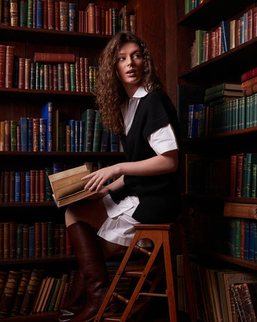 We saved the outfit that requires the "most" work for last, but even then, you'll find that it takes minimal effort. Start with a basic white or light blue shirt dress, and layer it with a warm, oversized vest. During colder months, throw on some stockings before putting on the boots. Not only does this look give off, "I'm always this put together," it's also easy to wear.